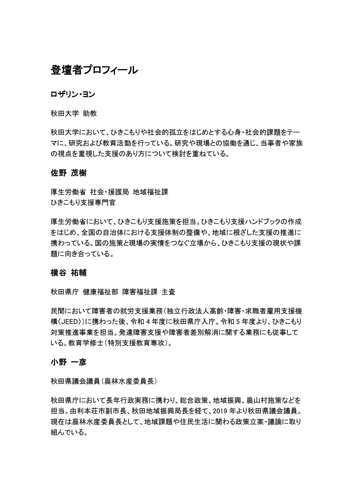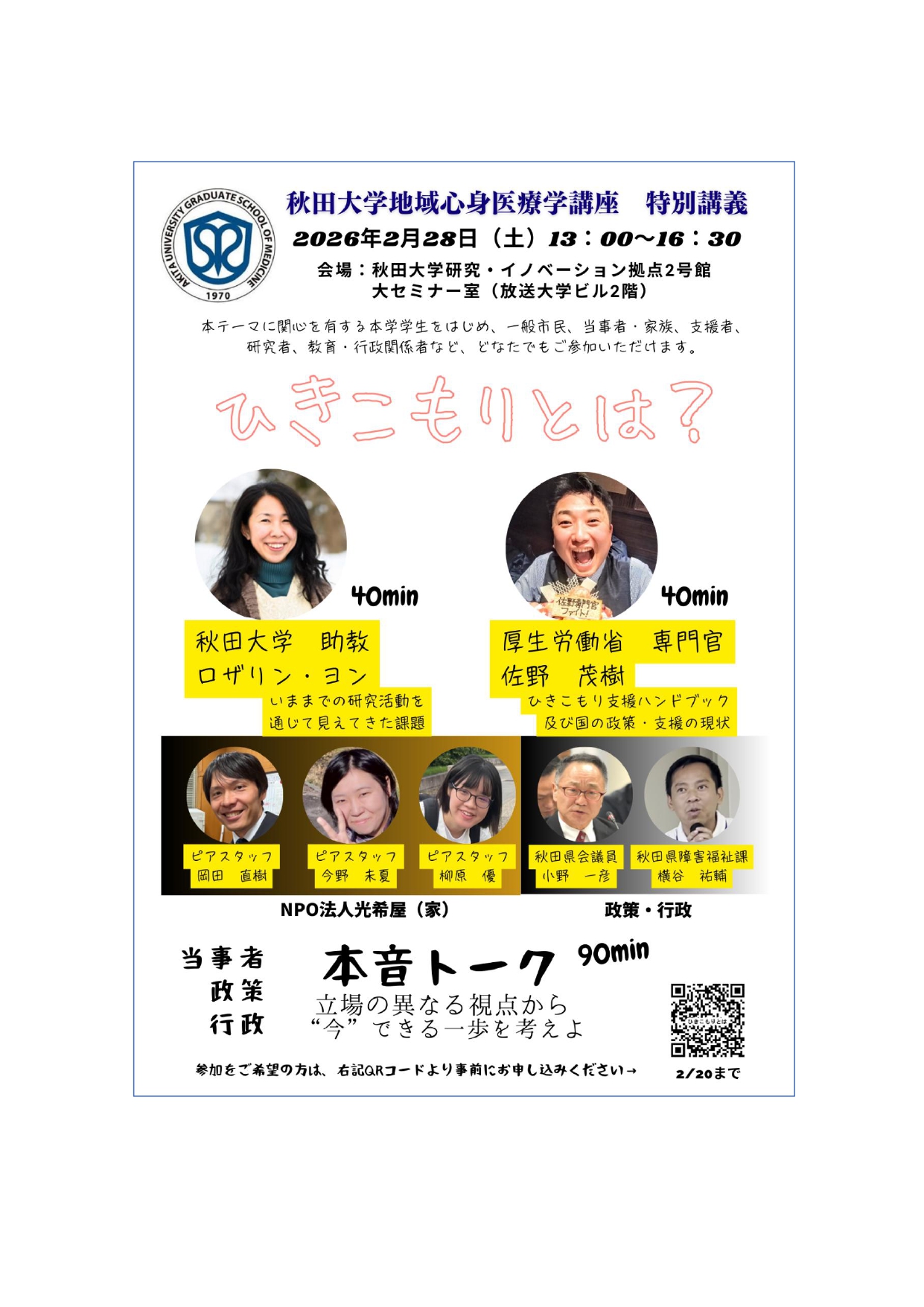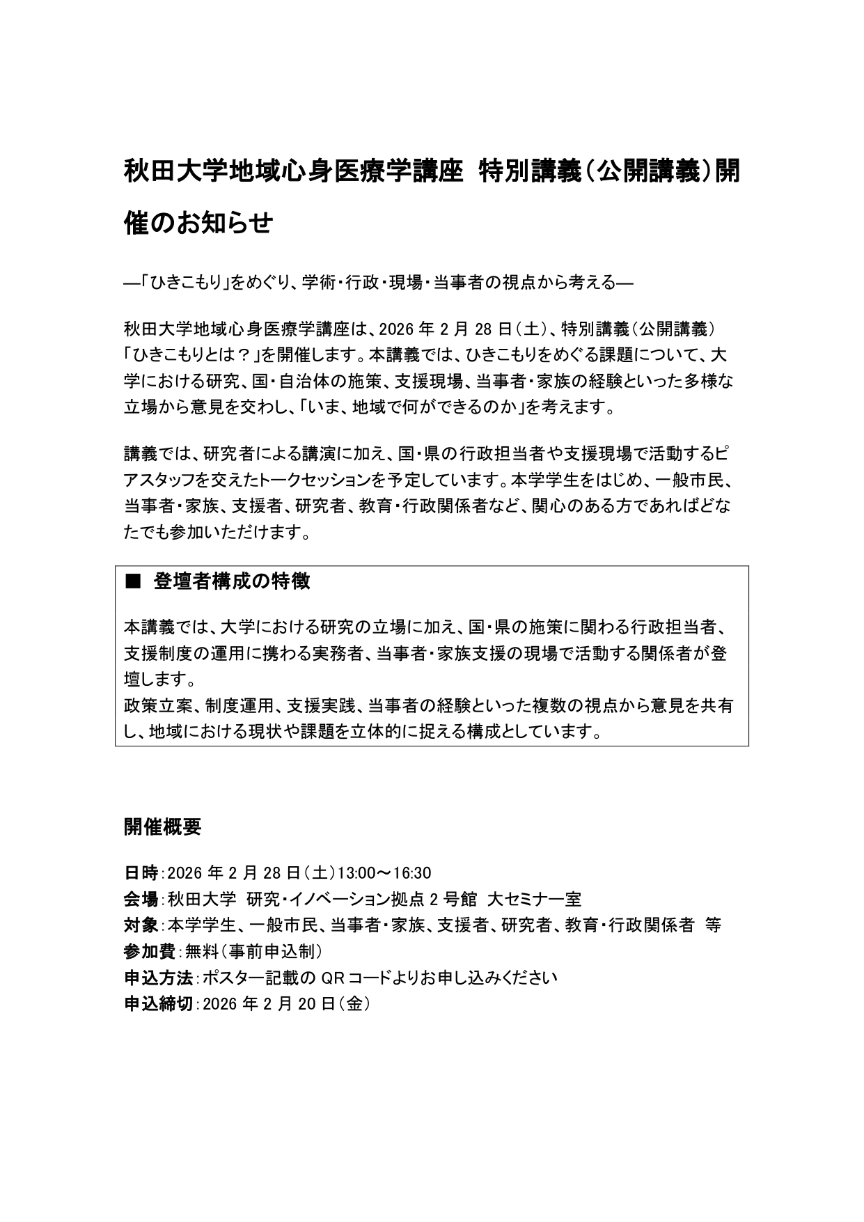 秋田大学地域心身医療学講座が開催する公開講義です。ひきこもりをめぐる課題について、大学における研究、国・自治体の施策、支援現場、当事者・家族の視点から意見を交わし、「いま、地域で何ができるのか」を考えます。研究者による講演に加え、行政担当者やピアスタッフを交えたトークセッションも予定しています。