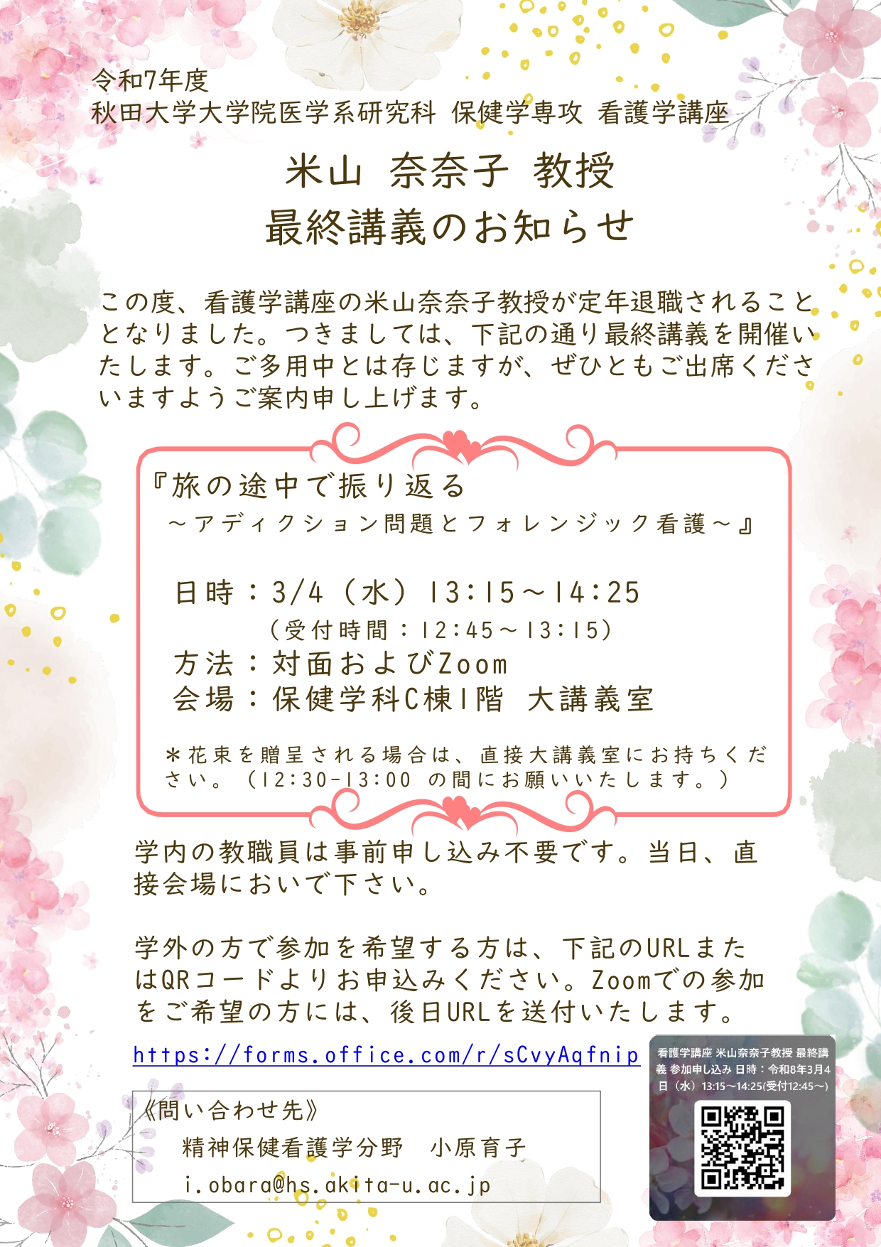 看護学講座 米山奈奈子教授 最終講義のご案内