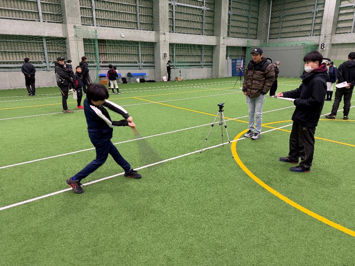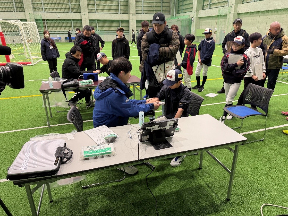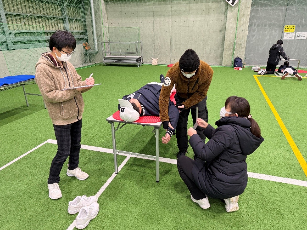 参加者は大学院医学系研究科保健学専攻の本郷道生教授、齊藤明准教授、照井佳乃助教、菊地翼助教、整形外科学講座の木村竜太先生、大学院生等(14名)、保健学科作業療法学専攻の学生(1名)らが運営する11のブースを順番に周り、超音波による肘の障害の有無の確認、骨の発達状況、靭帯や筋肉の状態、筋力や関節角度、柔軟性などを計測し、現在の身体の状態を確認しました。またプロチームでも使用されているスピードガンを使用して球速測定、スイングスピードの測定を行いました。さらにハイスピードカメラを用いた投球フォームのチェック・指導、予防のためのストレッチ指導も実施しました。