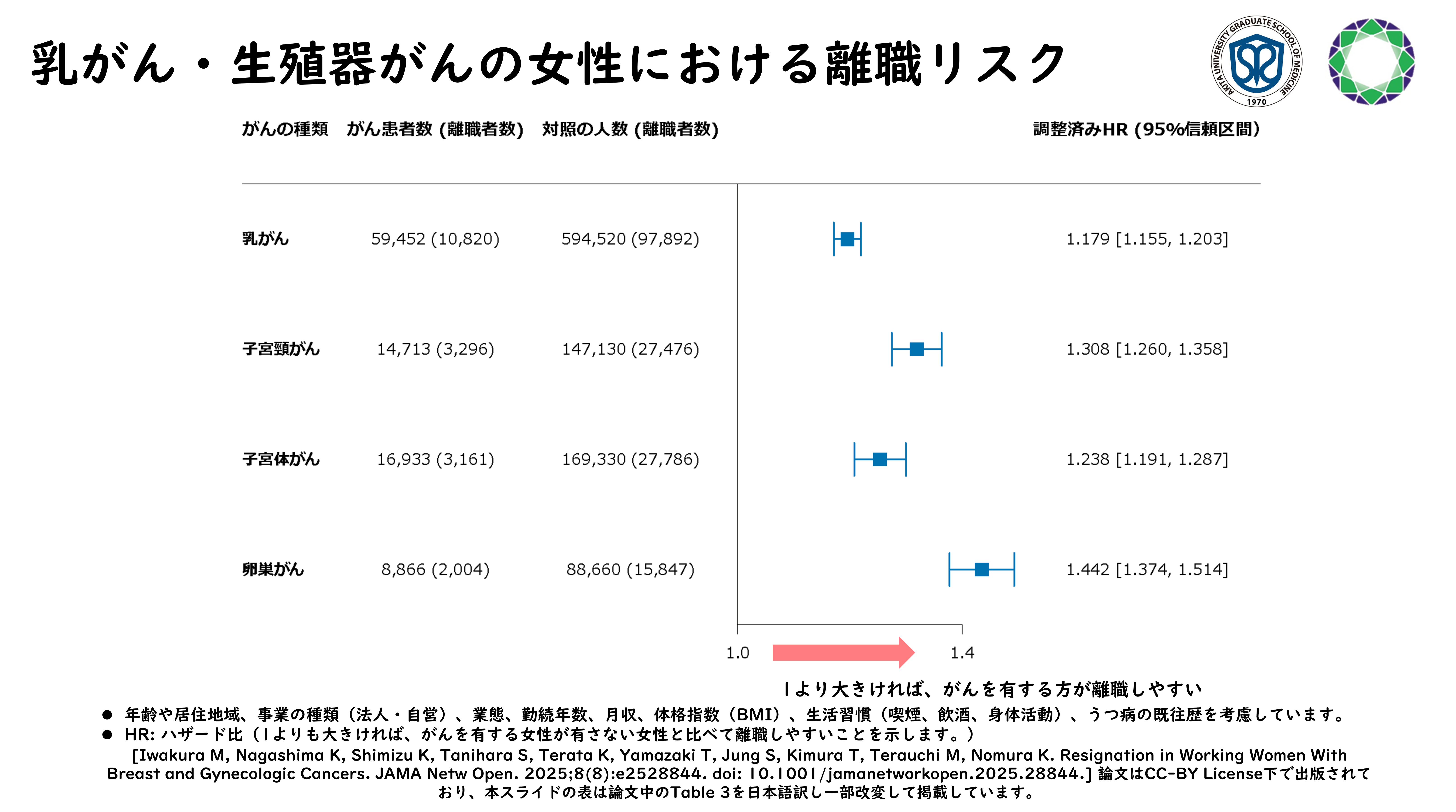 本研究は、日本最大の被用者保険者である協会けんぽが保有する大規模データベースを使い、乳がん・婦人科がんの診断が離職に関係すること、その中でもうつ病の既往歴がある、年齢が高い、賃金が低い、在職期間が長いこと、乳がんでは、特定健診を受けていないと、離職のリスクが高くなることを示した初めての研究です。