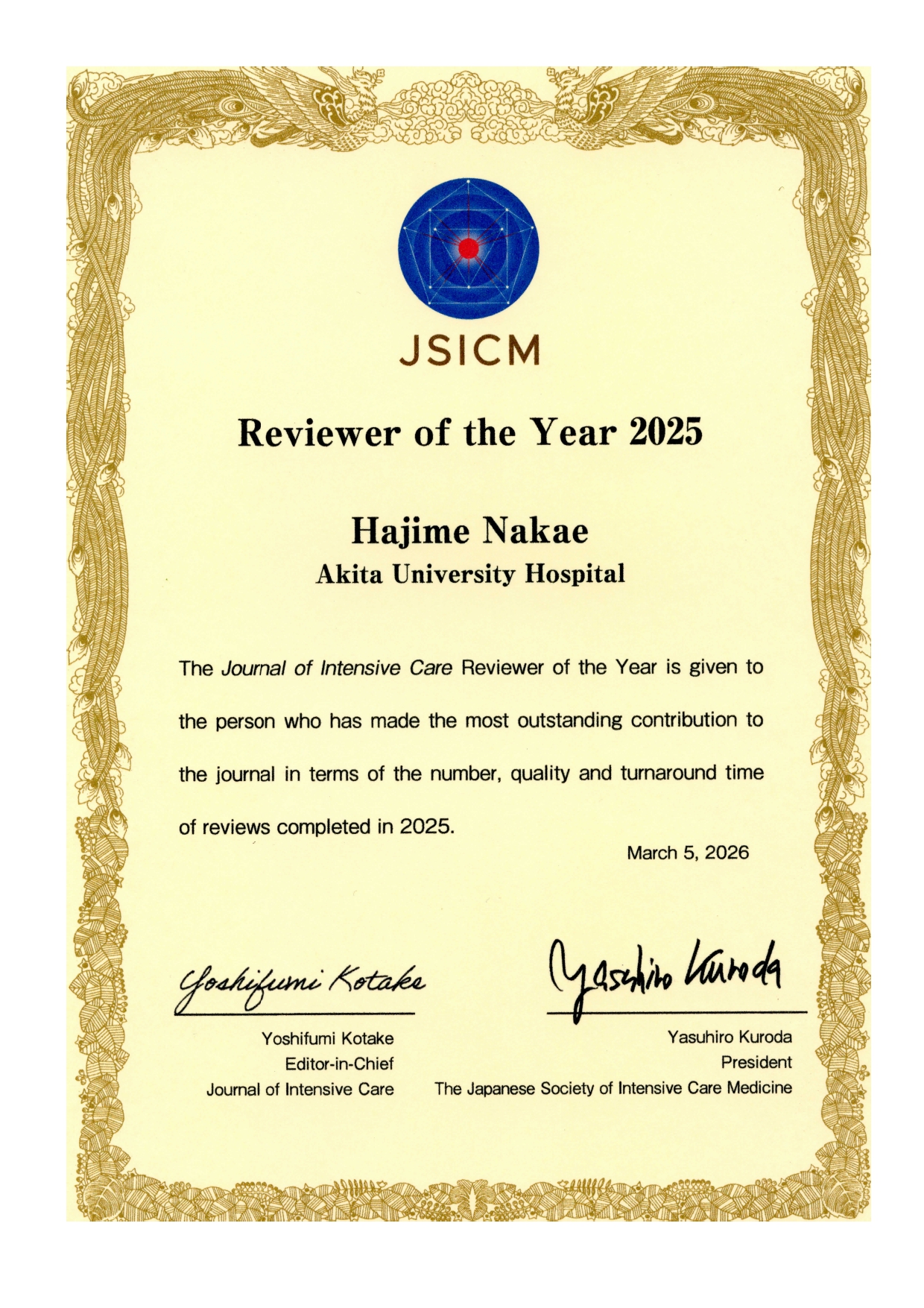 救急・集中治療医学講座 中永士師明 教授が、日本集中治療医学会英文機関紙『Journal of Intensive Care』において、「Reviewer of the year 2025(一般部門)」の第5位に選出されました。同誌のJournal Impact Factor2024は4.7であり、Critical Care 領域の全62誌中8位(上位25%以内)という高い水準を維持しています。 投稿数や海外からのアクセス数も依然として多く、国際的に高く評価されている学術誌です。中永教授の同賞受賞は3年連続となります。これは、国際的視野に基づいた質の高い査読を、迅速かつ的確に遂行し続けていることが正当に評価されたものです。