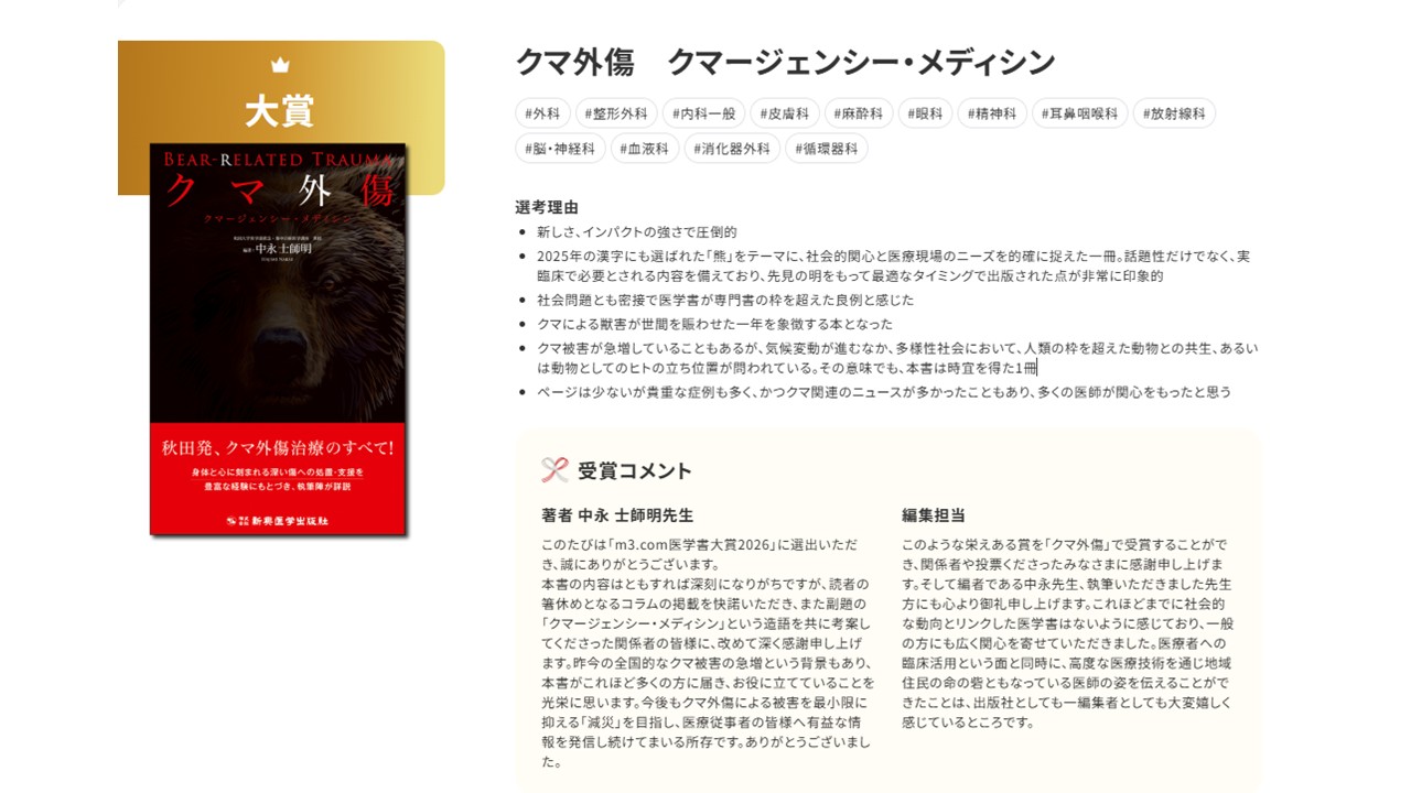 救急・集中治療医学講座の中永士師明教授が編著を務めた『クマ外傷 クマージェンシー・メディシン』が、「M3医学書大賞2026」に選出されました。